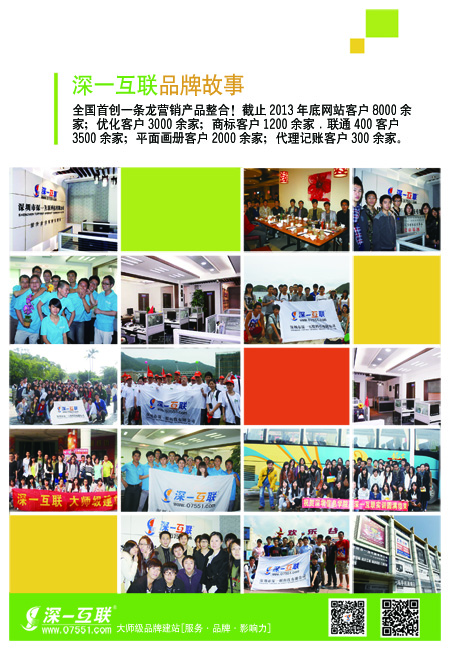 全國首創(chuàng)一條龍營銷產(chǎn)品整合!截止2013年底網(wǎng)站客戶8000余家;優(yōu)化客戶3000余家;商標(biāo)客戶1200余家.聯(lián)通400客戶3500余家;平面畫冊客戶2000余家;代理記賬客戶300余家。